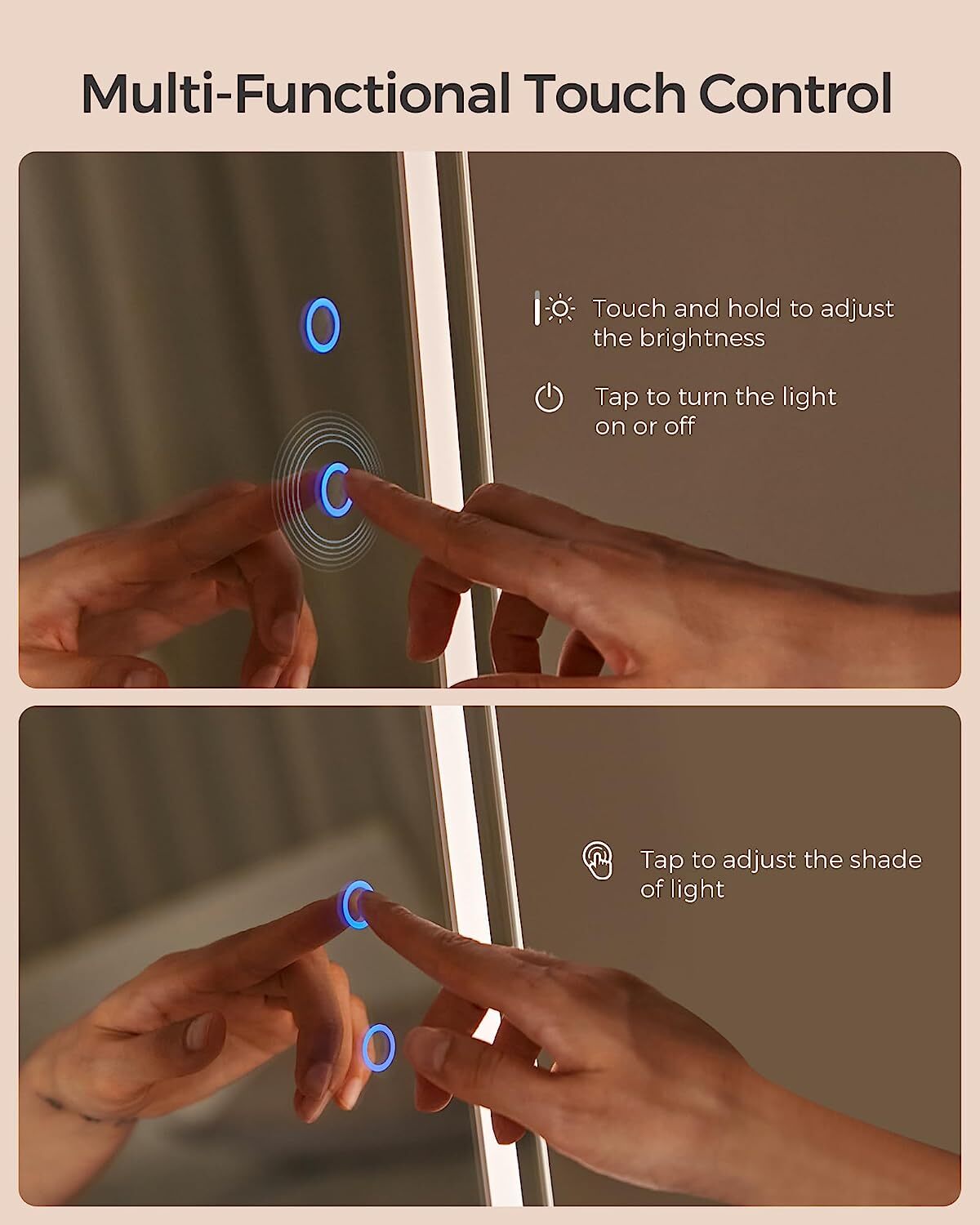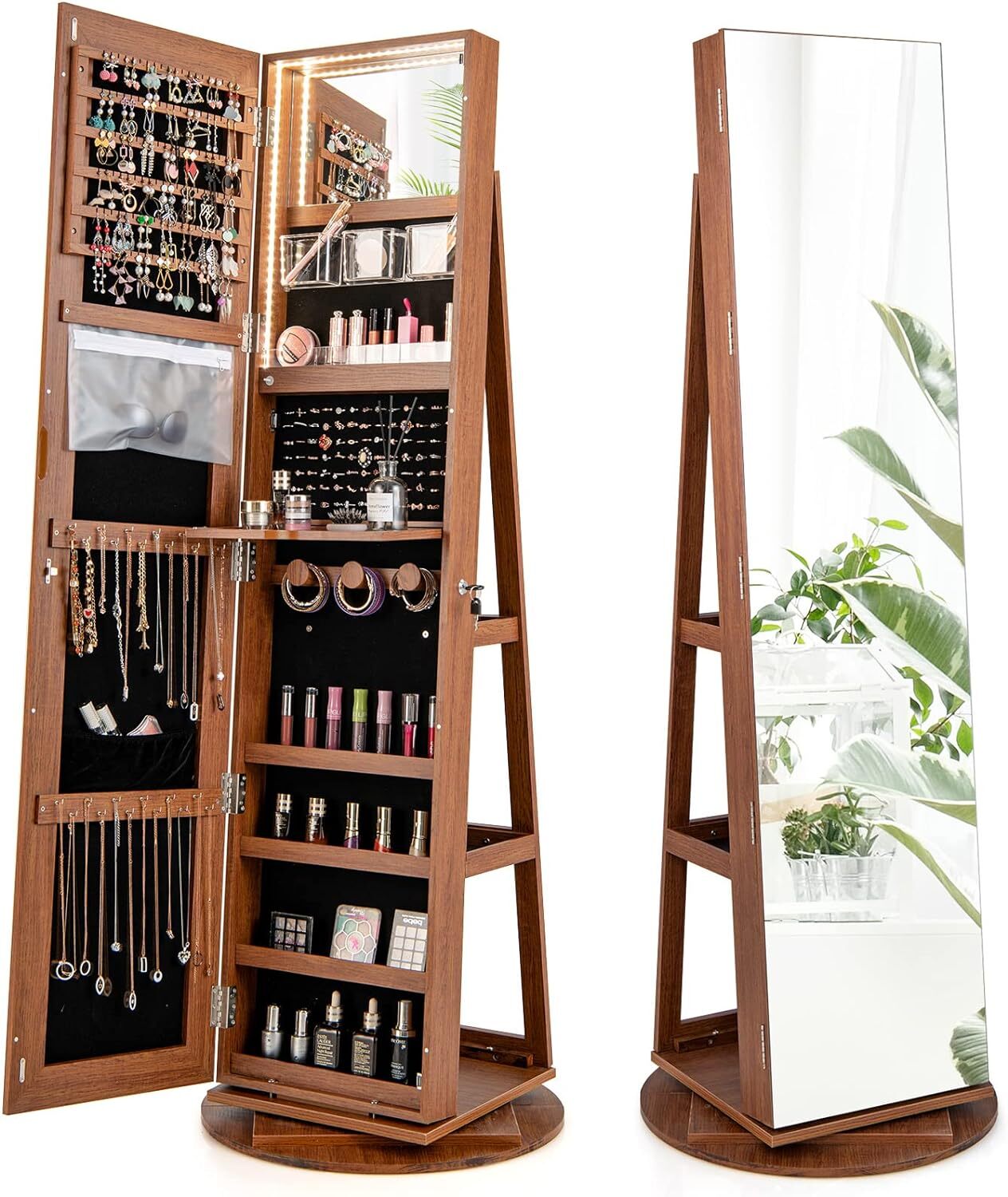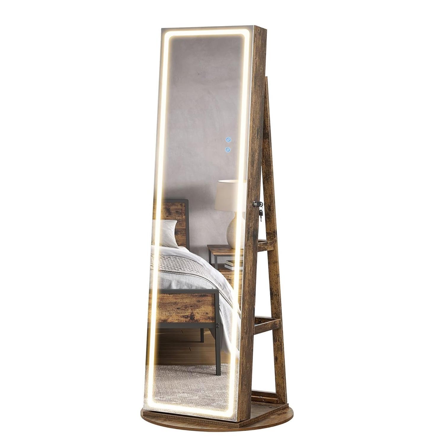 - [Full-Length Mirror with Adjustable LED Lights] This non-rotatable jewelry cabinet boasts a full-length mirror with dimmable LED lights that have 3 shades of light and a smart memory function—you can use the touch button to find the perfect lighting to check your look